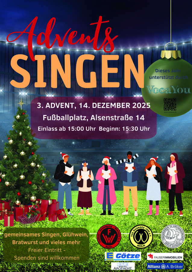 Nachdem unsere Premiere im letzten Jahr so viel Freude und Begeisterung ausgelöst hat, laden der Förderverein der evangelischen Kirchengemeinde, der TuS Wannsee 1896 e.V. und die Fußball-Vereinigung Wannsee e.V. auch in diesem Jahr wieder ganz herzlich zum Adventssingen auf unserem Kunstrasenplatz ein.