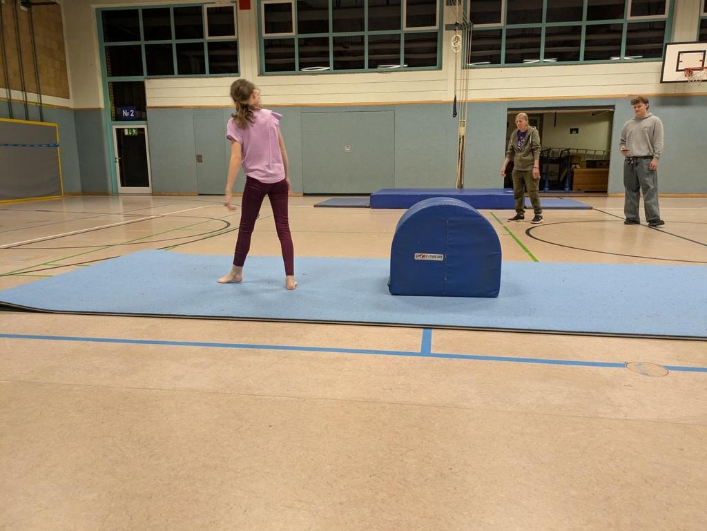 Alles, was sich in der Turnhalle an Geräten (Kasten, Pferd, Bock, Barren usw.) befindet, wird zu verschiedenen Parcours zusammengestellt. Die Kinder können und sollen die Geräte spielerisch erforschen, einfache Turnübungen bewältigen und somit eine größere Bewegungssicherheit entwickeln.